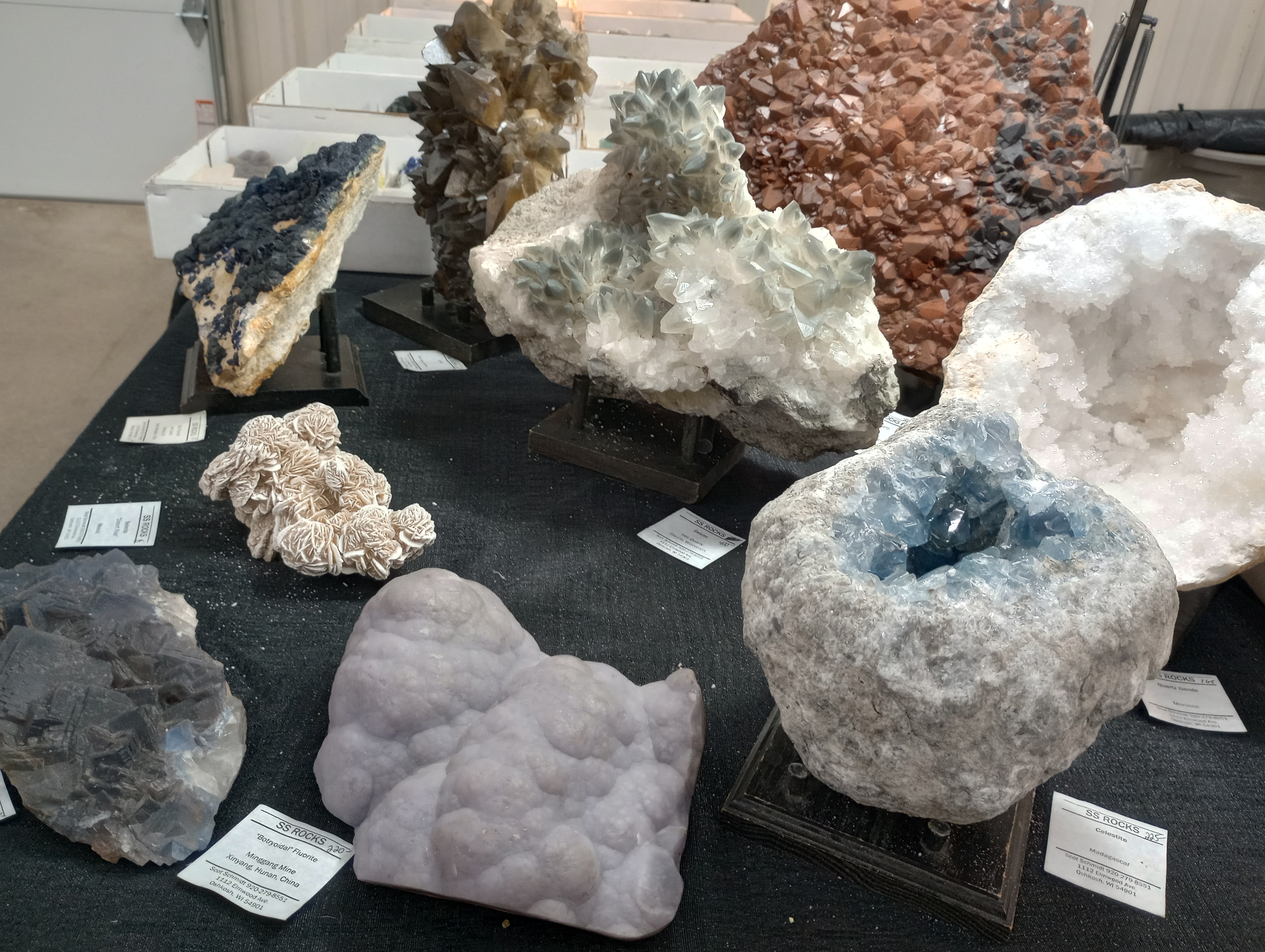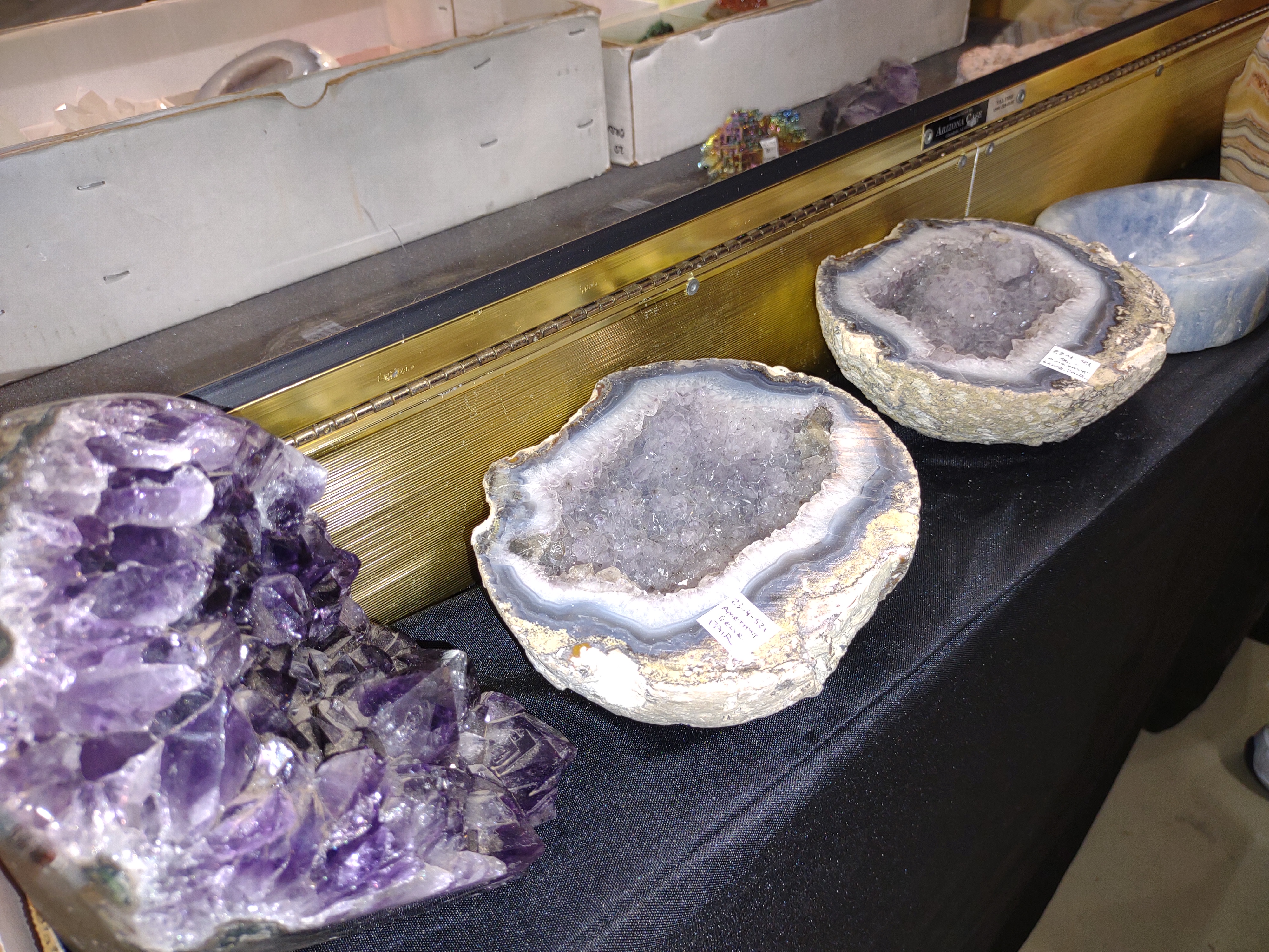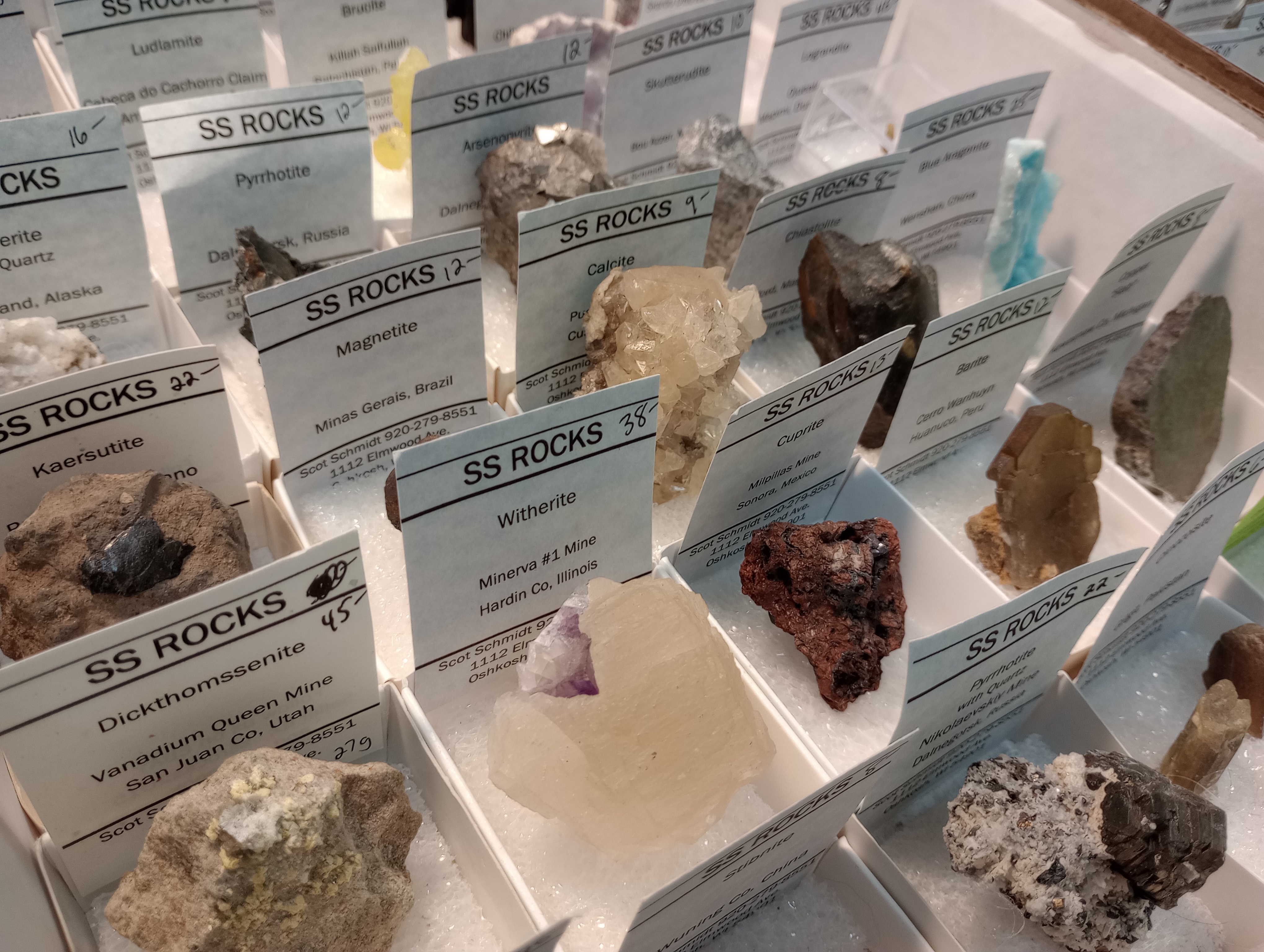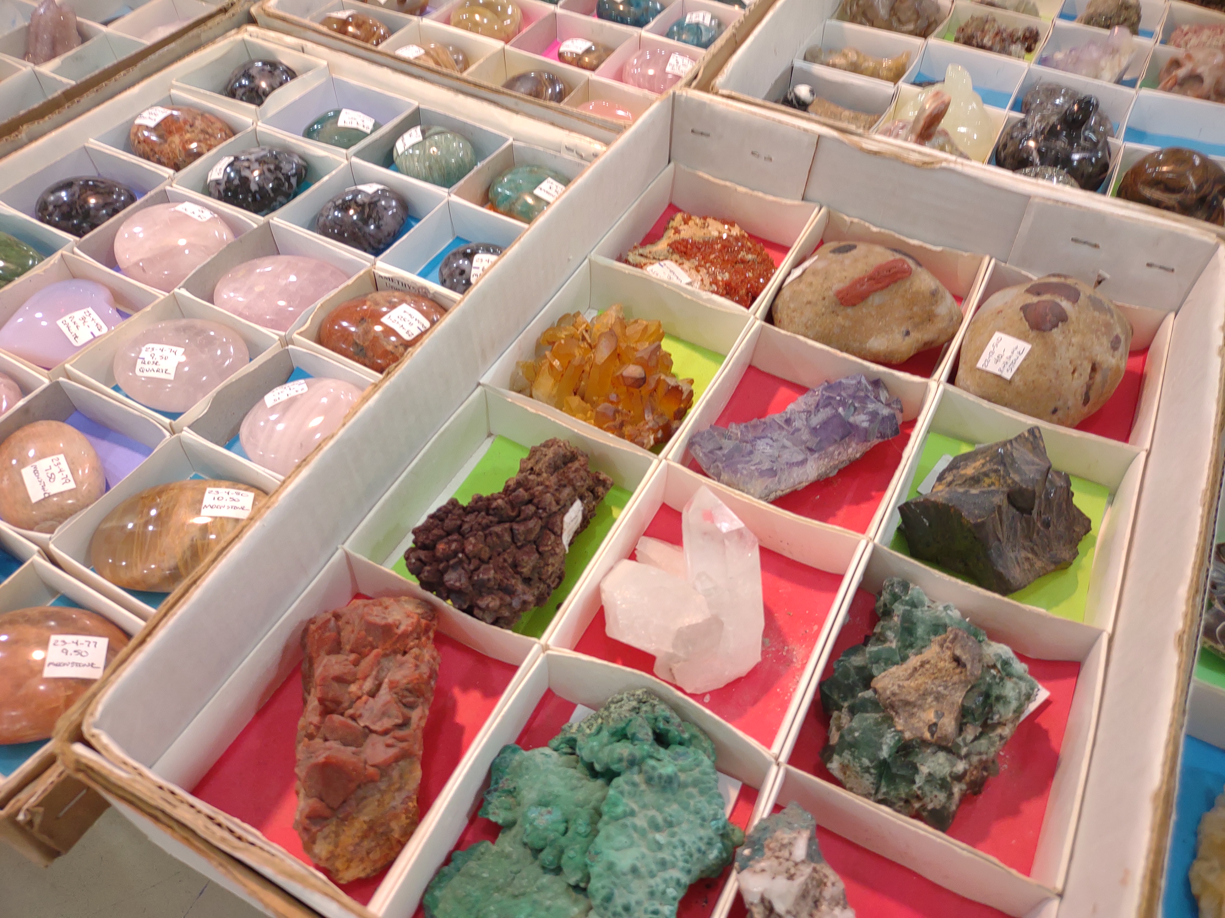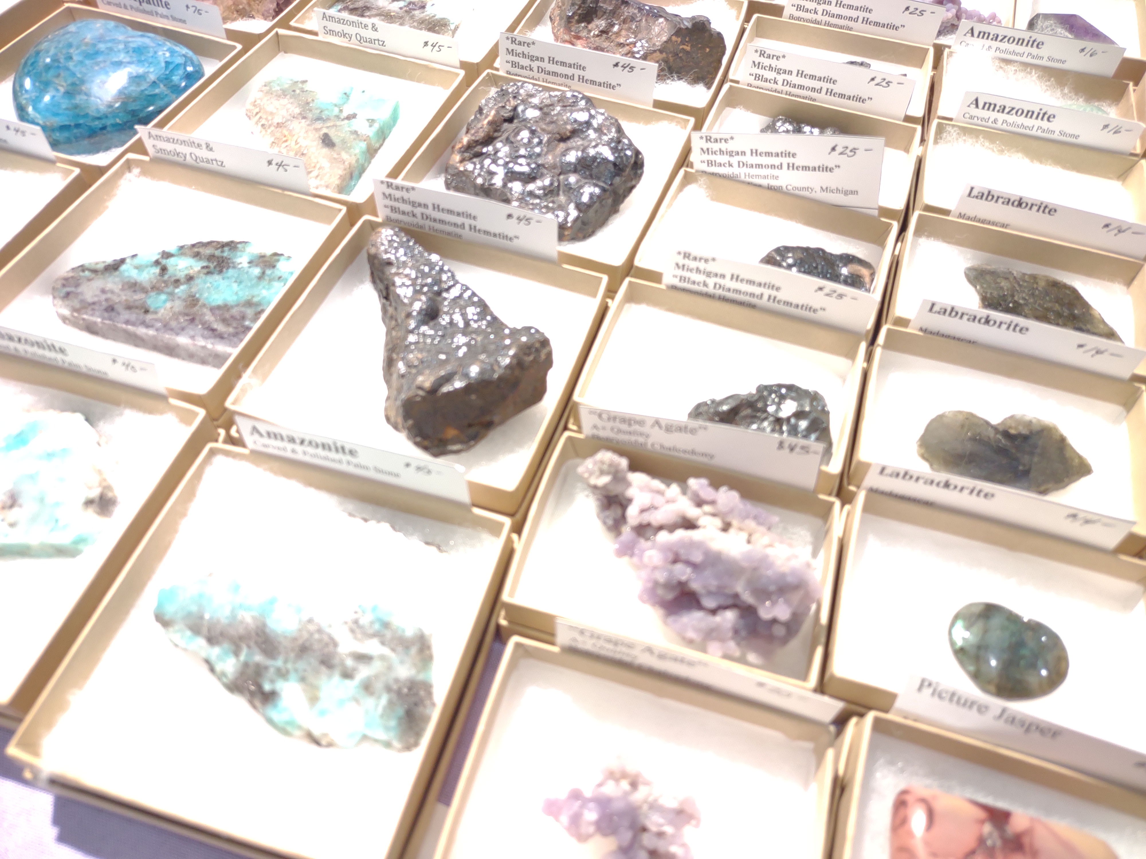 Kitz PresentationsEnjoy these views of nature all under one roof one day a year at a rock show near you or now. Start with May 2023 with a collection of amber. Can you name each rock that you see? Some rocks are polished and used to make things like jewelry or home decor. Others are for collectors who display them at home. Which ones do you like? A light box or stand can help with objects like crystal displays. Geodes are cut open to reveal crystals within. Some rocks are carved. Can you find any? You can see prices on some of the items for sale. You can also find fossils of various sizes at these shows.
