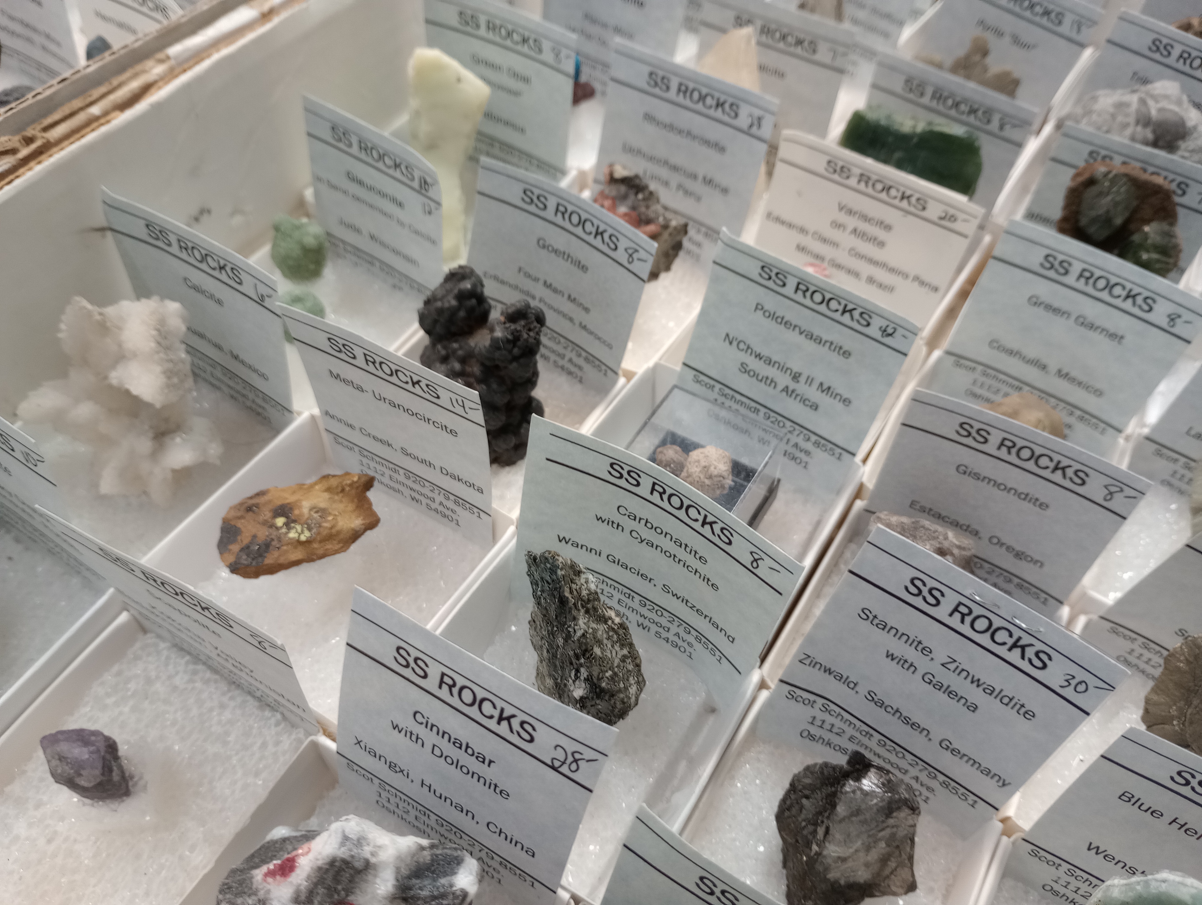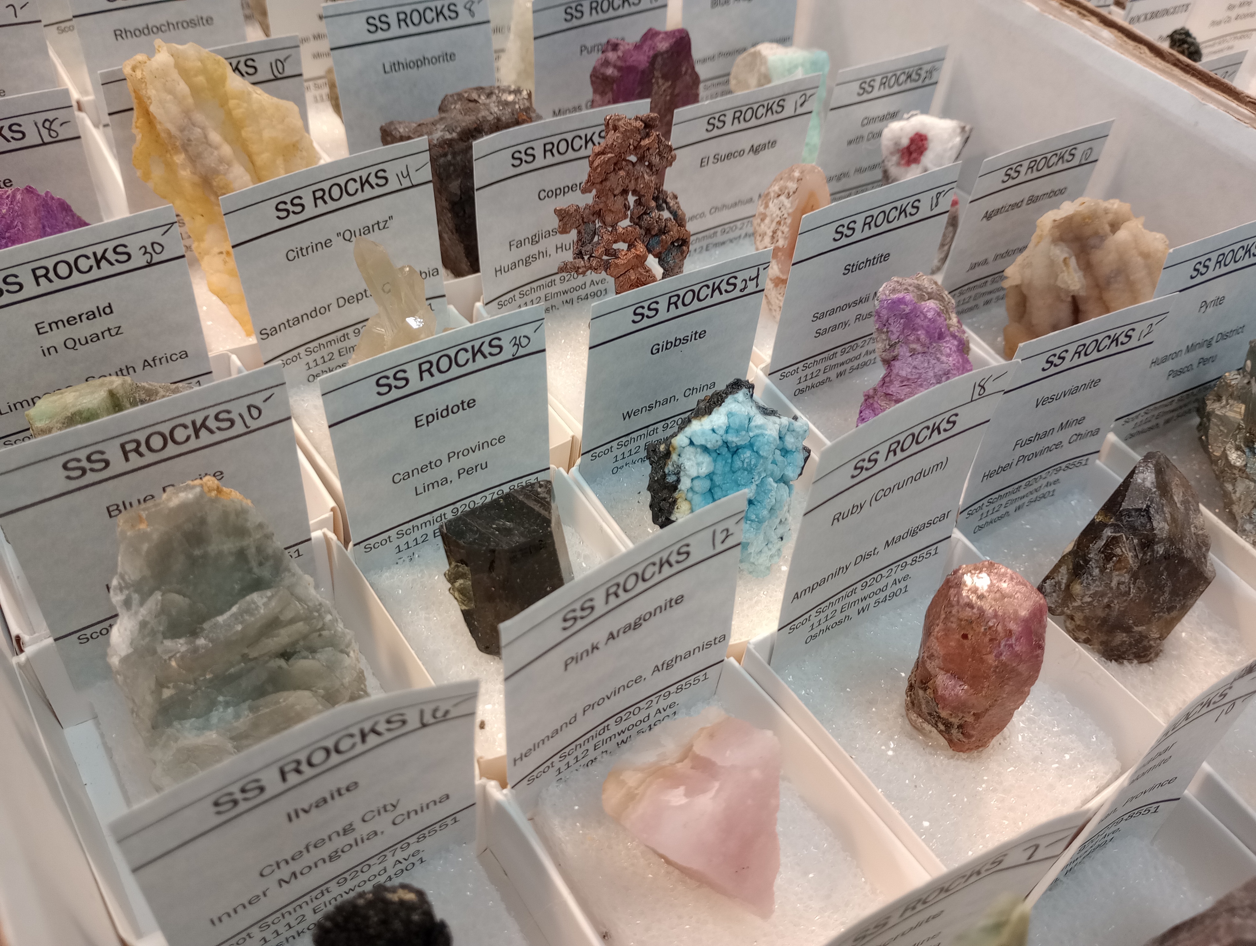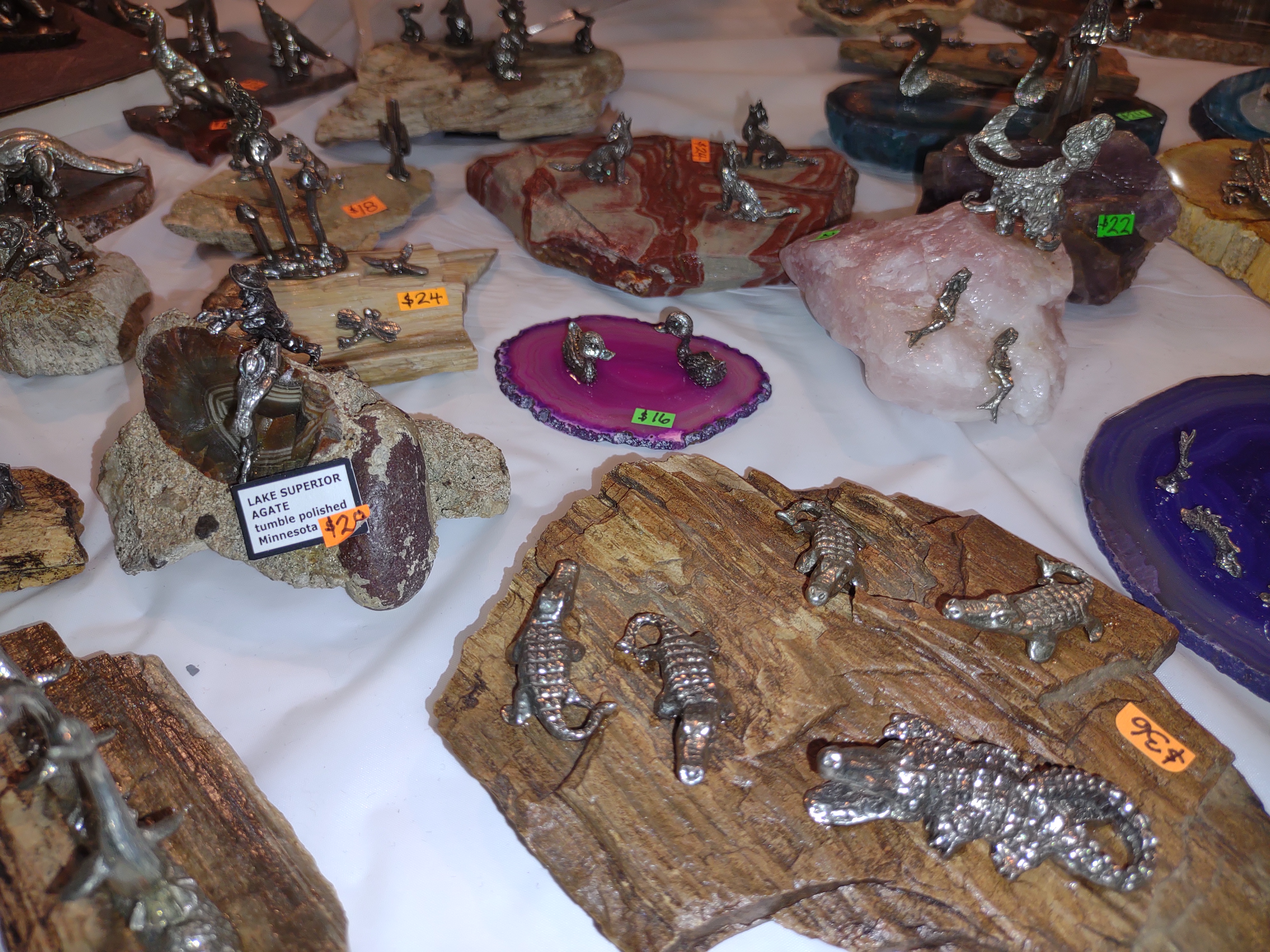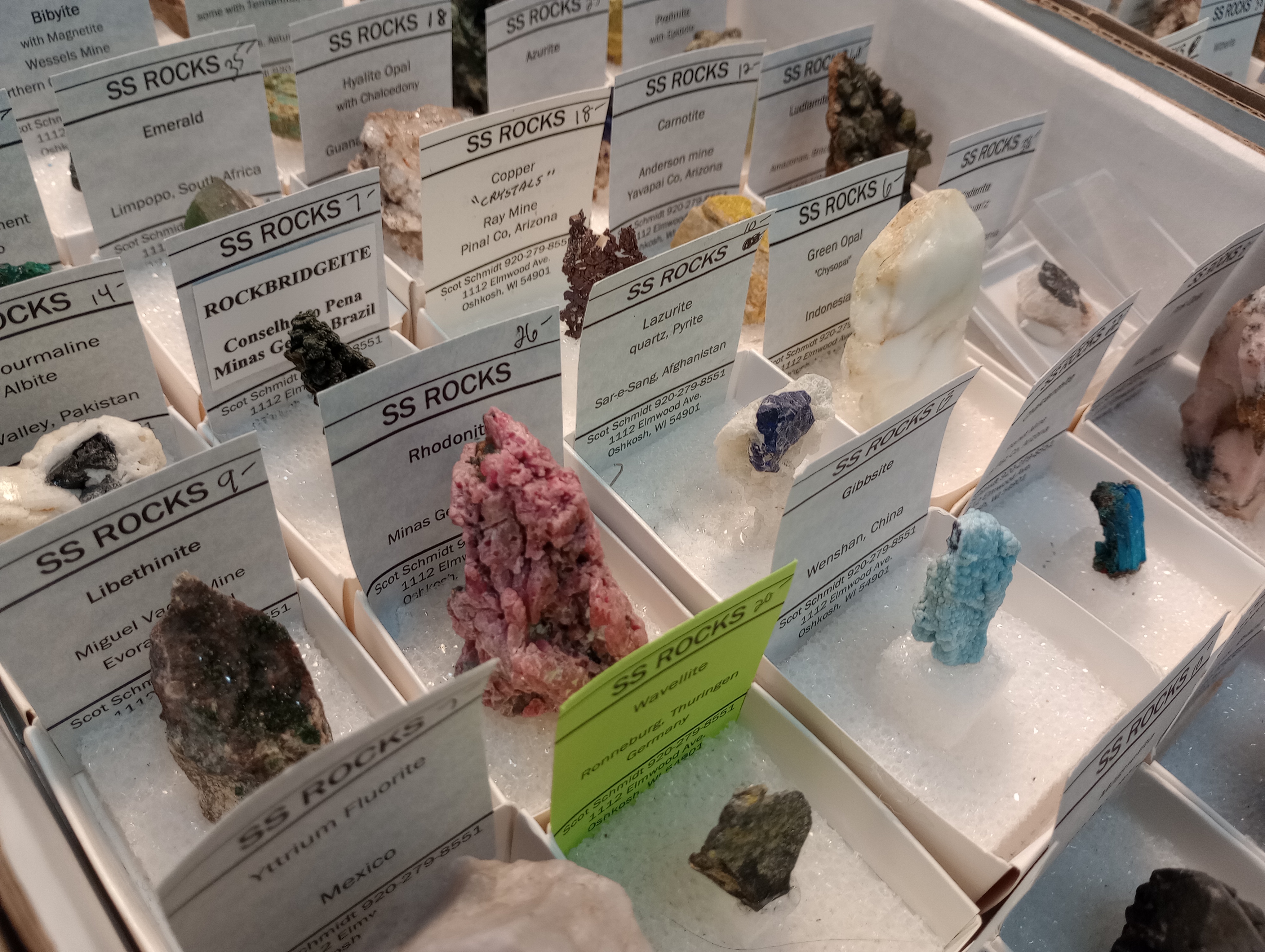 Kitz PresentationsEnjoy these views of nature all under one roof one day a year at a rock show near you or now. Start with May 2023 with a collection of amber. Can you name each rock that you see? Some rocks are polished and used to make things like jewelry or home decor. Others are for collectors who display them at home. Which ones do you like? A light box or stand can help with objects like crystal displays. Geodes are cut open to reveal crystals within. Some rocks are carved. Can you find any? You can see prices on some of the items for sale. You can also find fossils of various sizes at these shows.