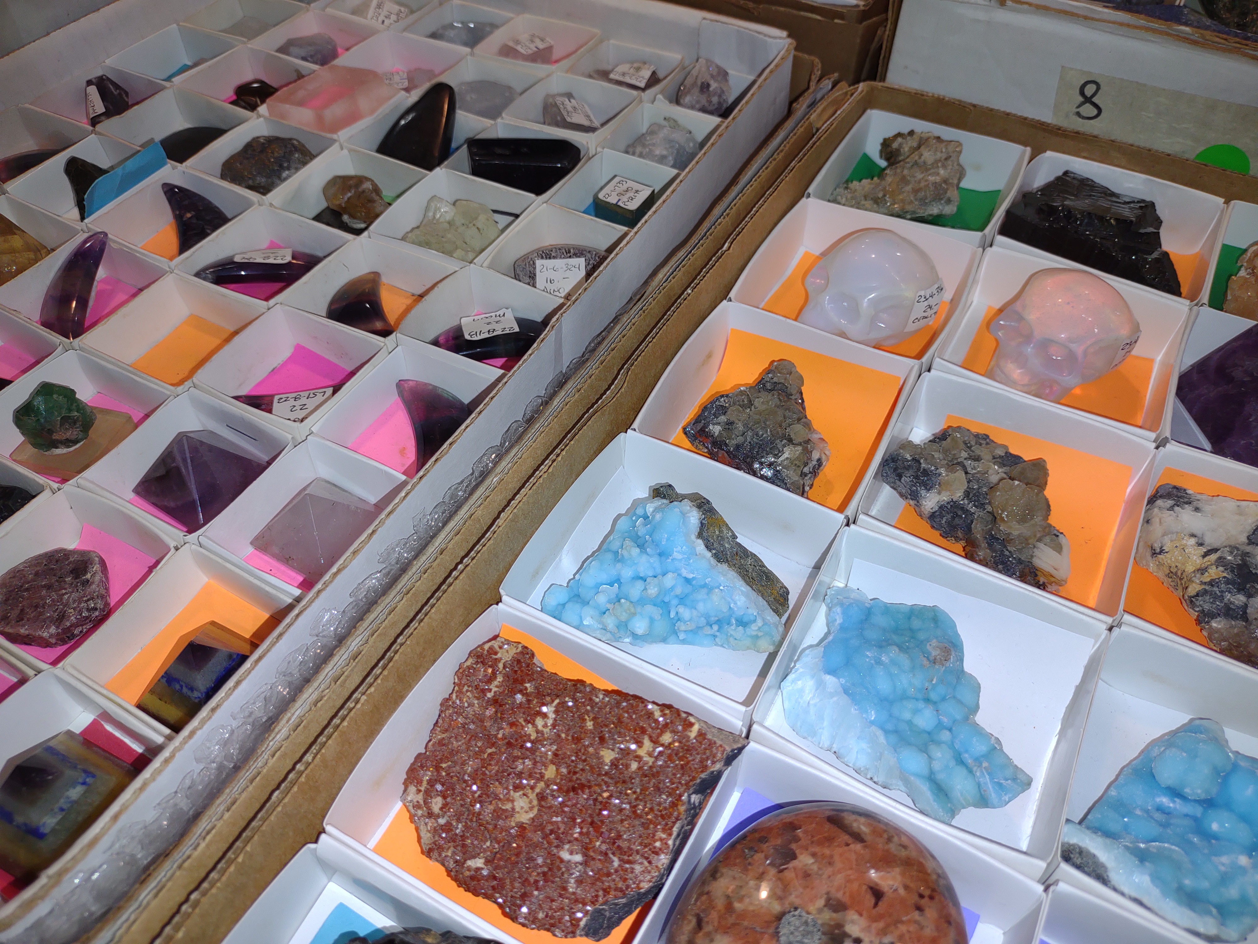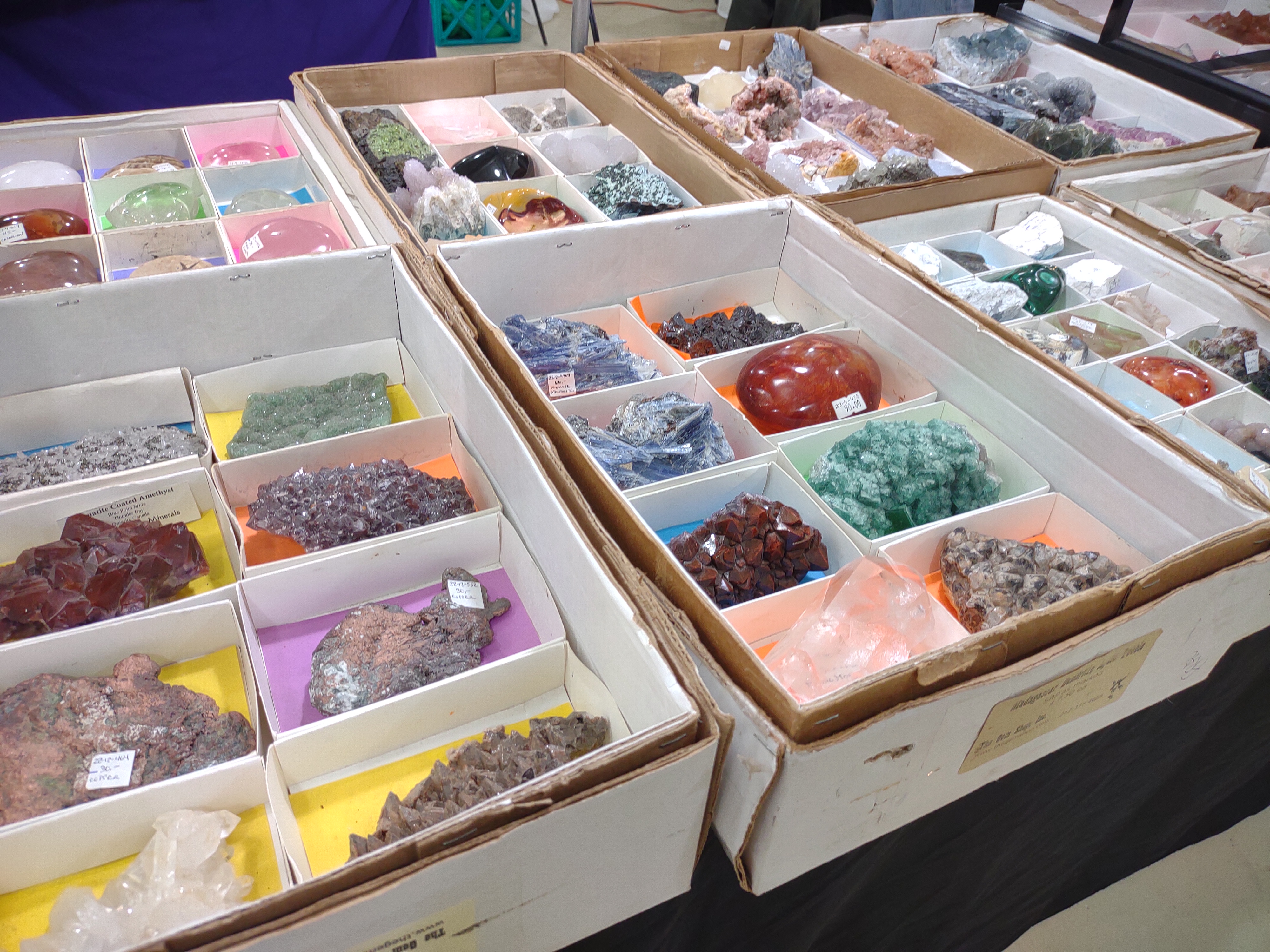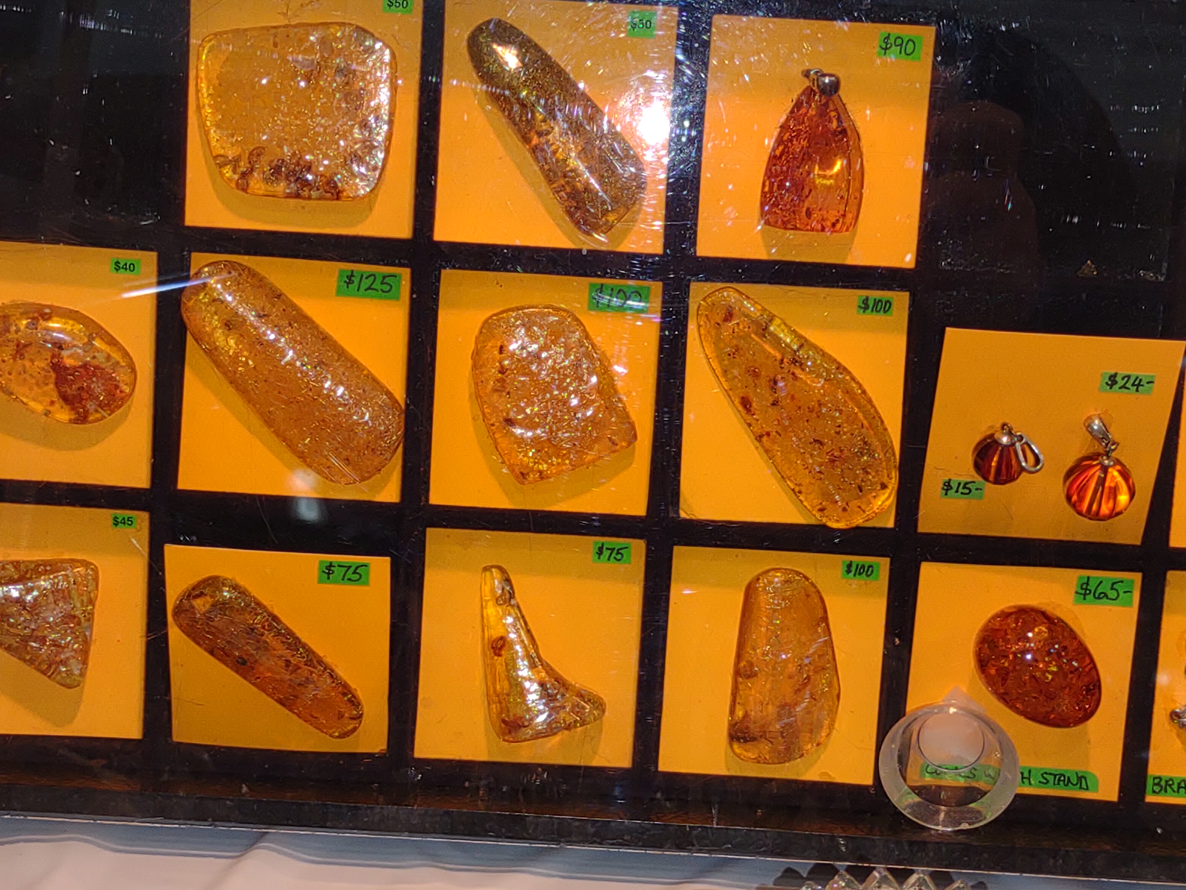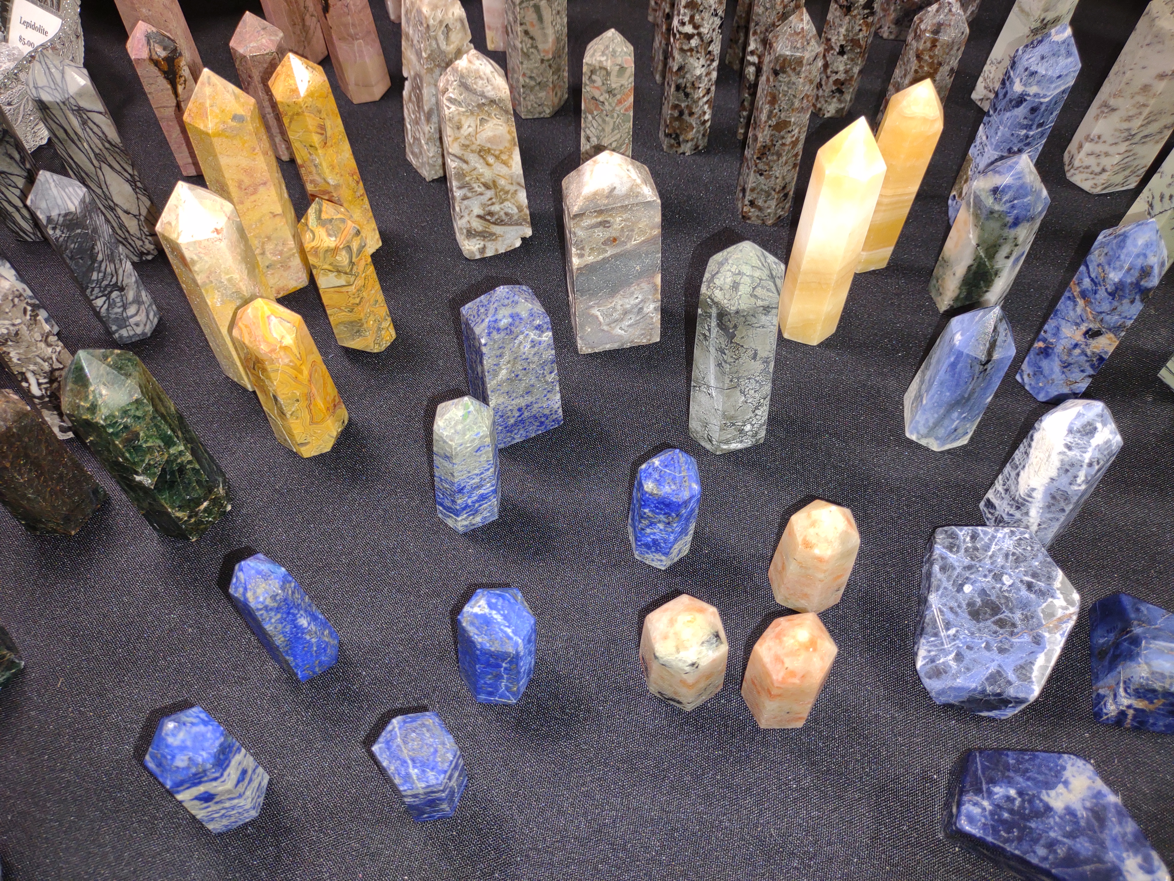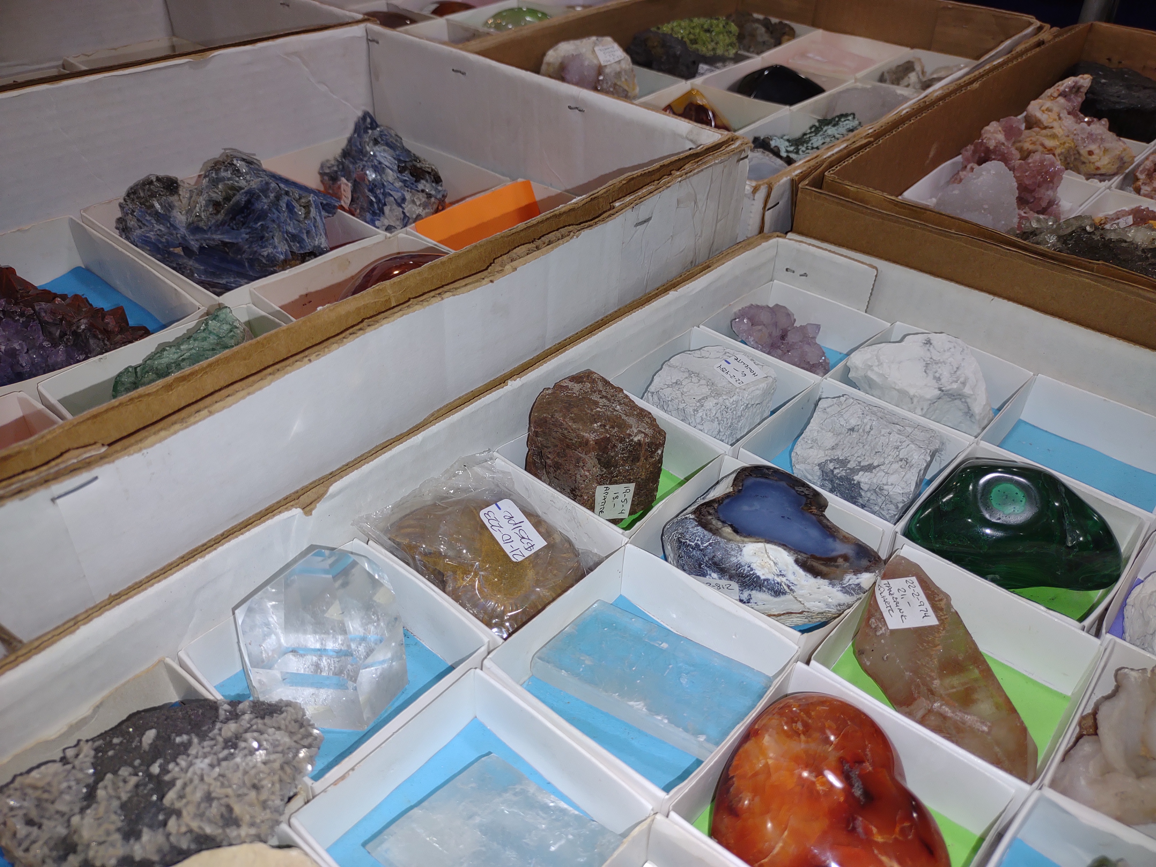 Kitz PresentationsEnjoy these views of nature all under one roof one day a year at a rock show near you or now. Start with May 2023 with a collection of amber. Can you name each rock that you see? Some rocks are polished and used to make things like jewelry or home decor. Others are for collectors who display them at home. Which ones do you like? A light box or stand can help with objects like crystal displays. Geodes are cut open to reveal crystals within. Some rocks are carved. Can you find any? You can see prices on some of the items for sale. You can also find fossils of various sizes at these shows.