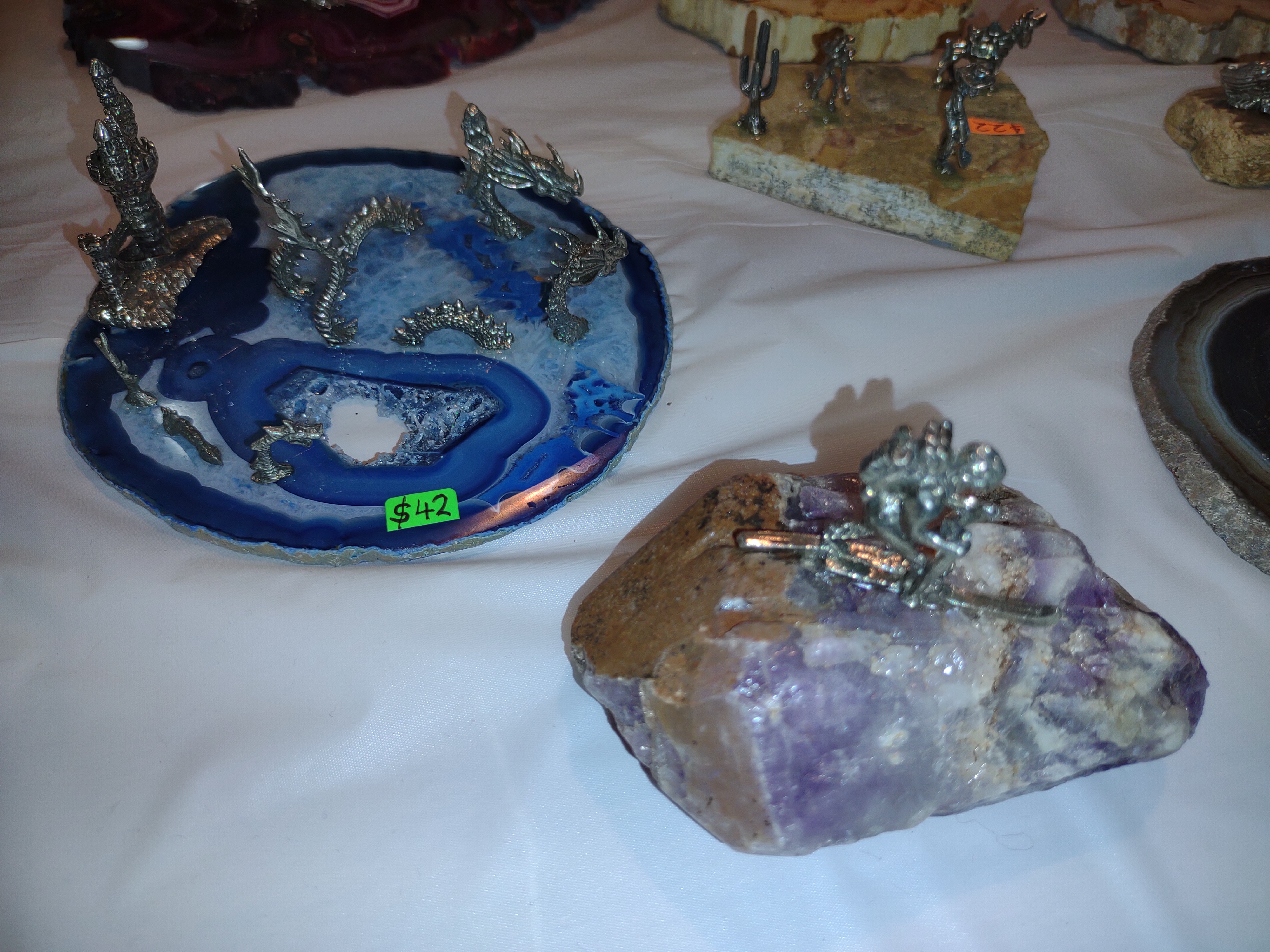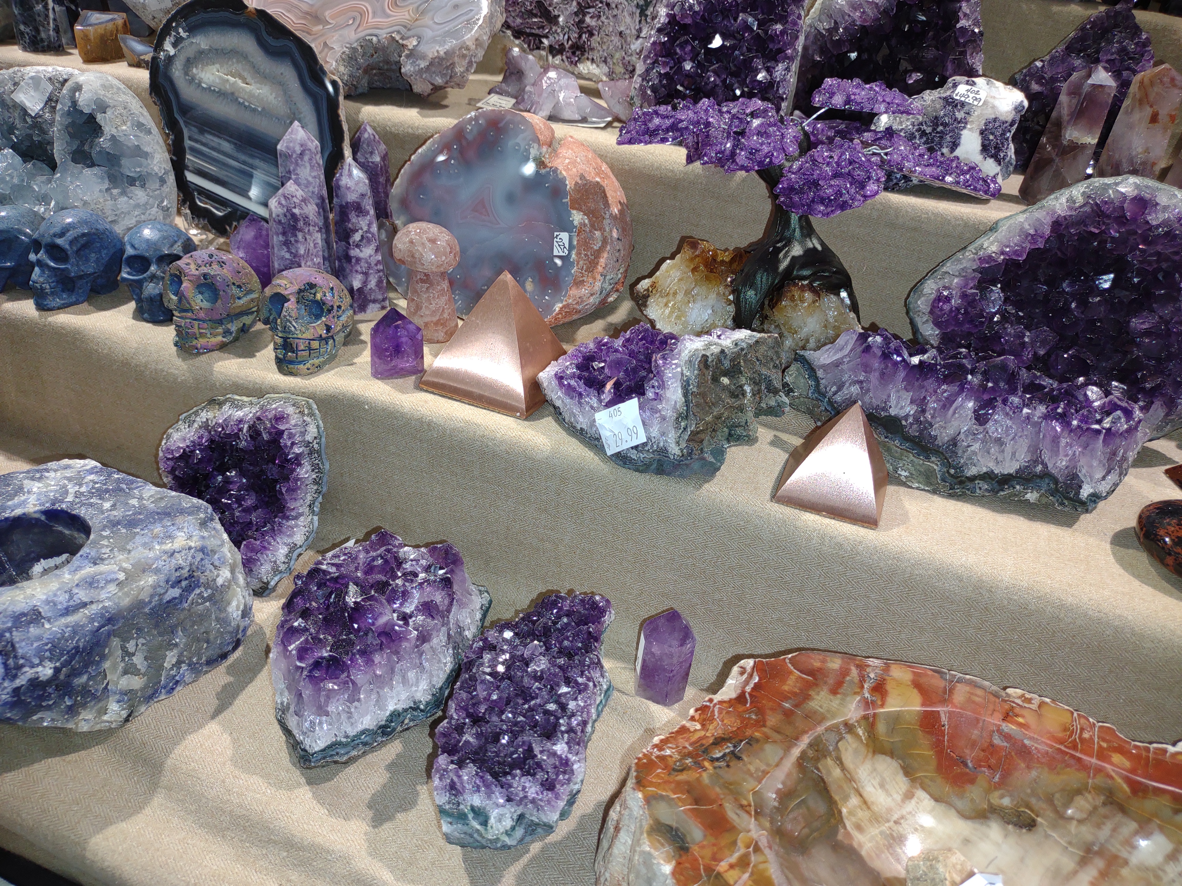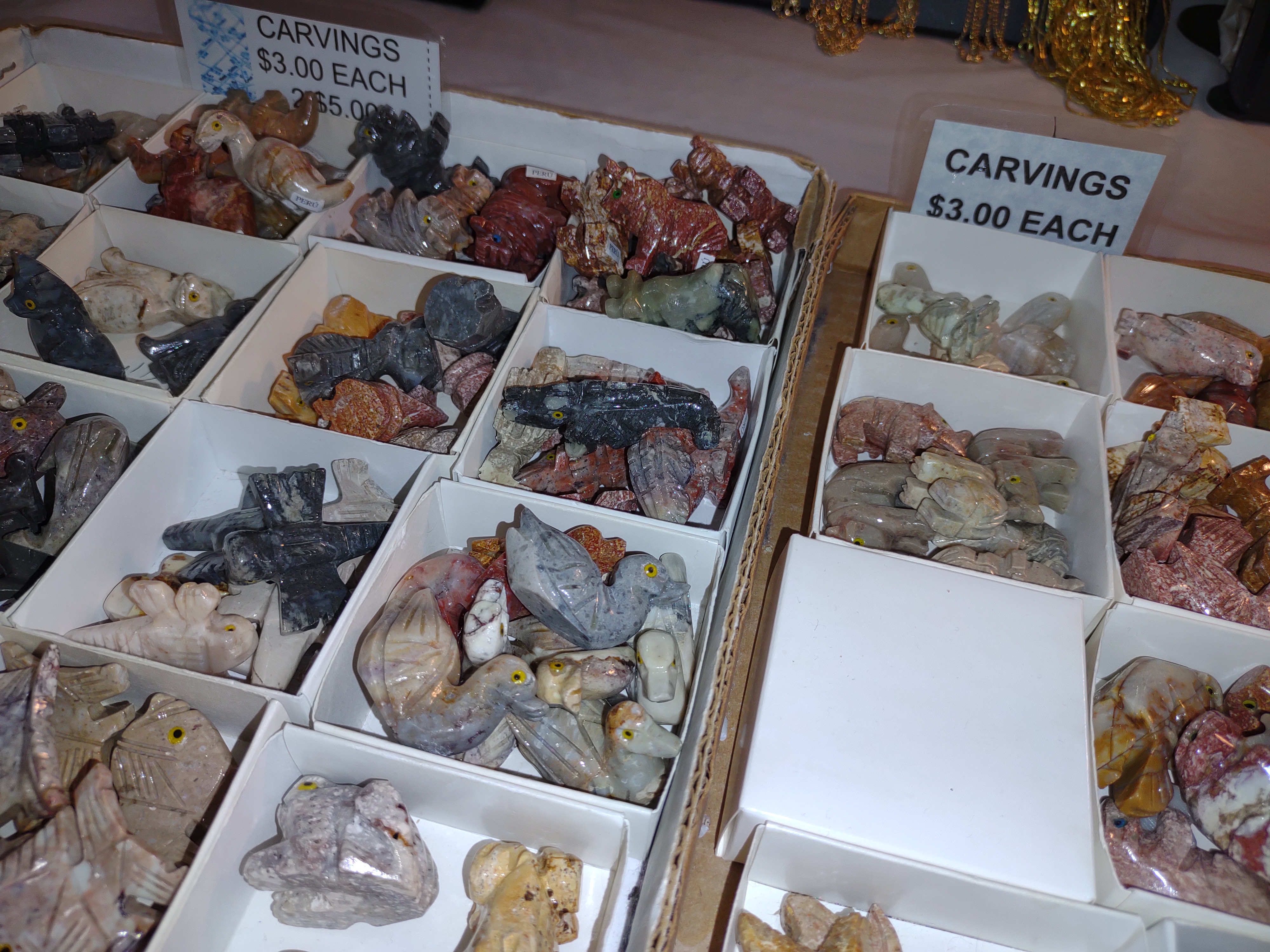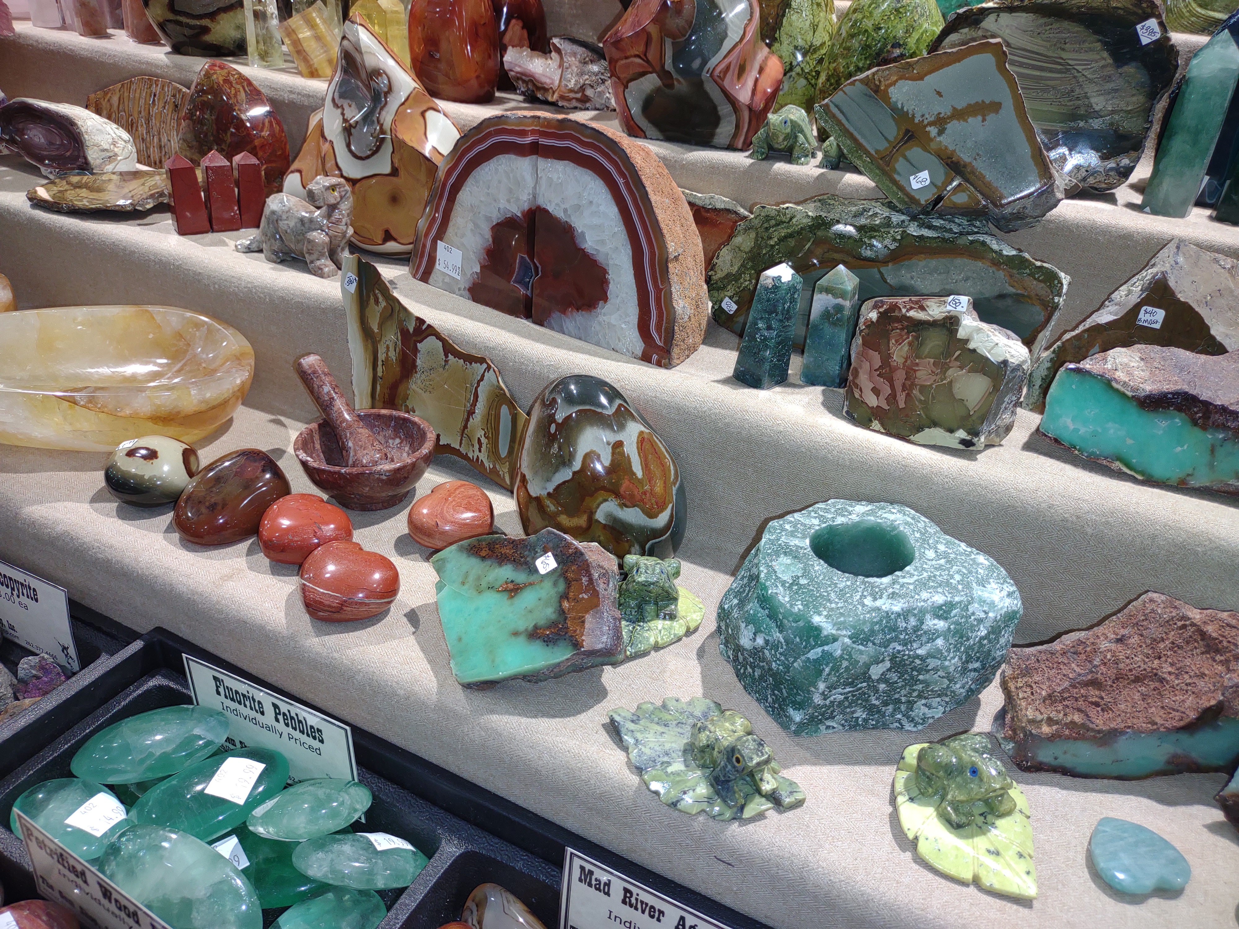 Kitz PresentationsEnjoy these views of nature all under one roof one day a year at a rock show near you or now. Start with May 2023 with a collection of amber. Can you name each rock that you see? Some rocks are polished and used to make things like jewelry or home decor. Others are for collectors who display them at home. Which ones do you like? A light box or stand can help with objects like crystal displays. Geodes are cut open to reveal crystals within. Some rocks are carved. Can you find any? You can see prices on some of the items for sale. You can also find fossils of various sizes at these shows.